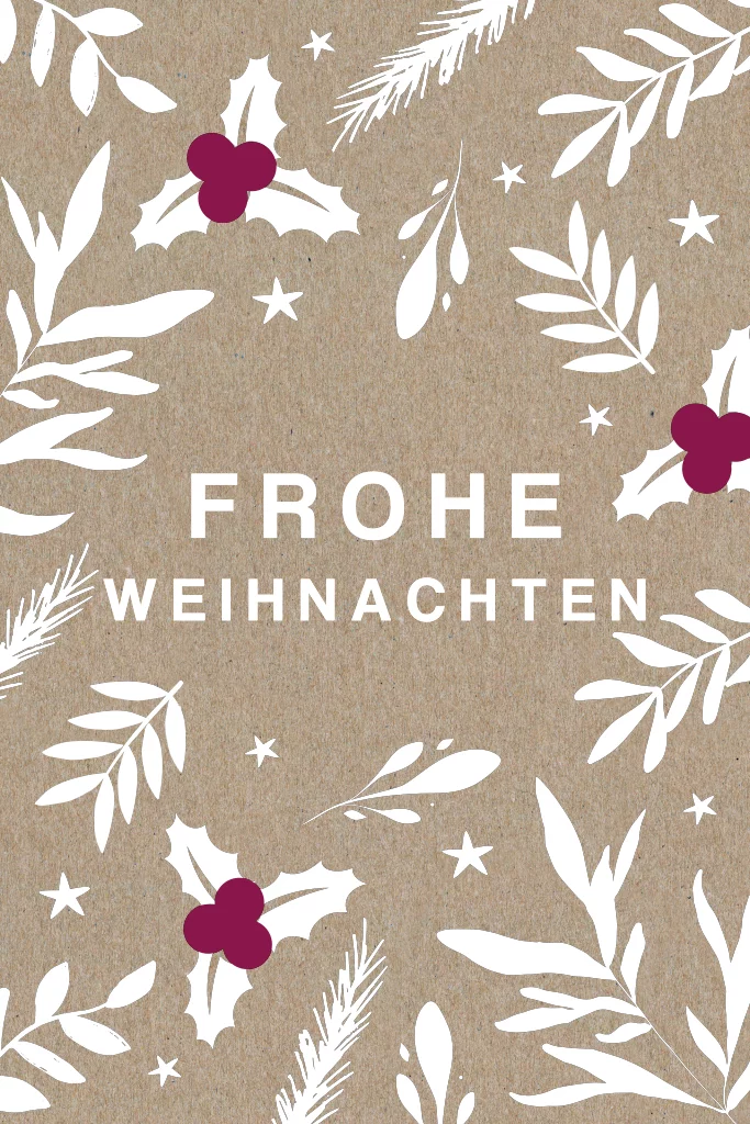 Hübsche Weihnachtskarte mit weißen Pflanzen auf Kraftpapier
