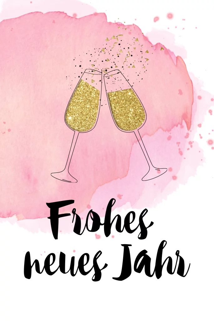 Hübsche Neujahrskarte mit rosa Pastellwolke und zwei Sektgläsern