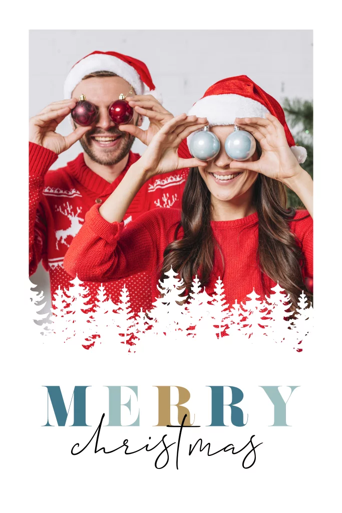 Hübsche Weihnachtskarte vielen weißen Tannen und Ihrem Foto