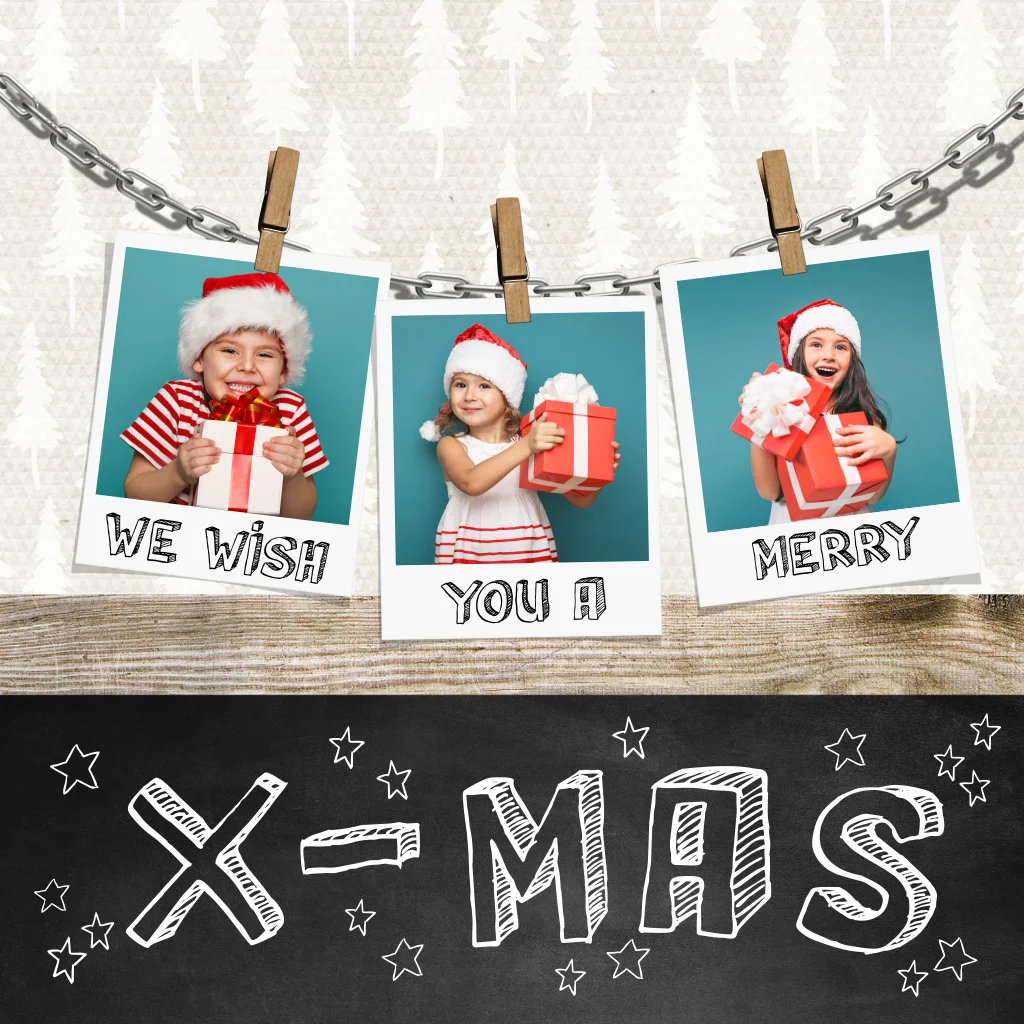 Trendige Weihnachtskarte mit drei Bildern an einer Kette