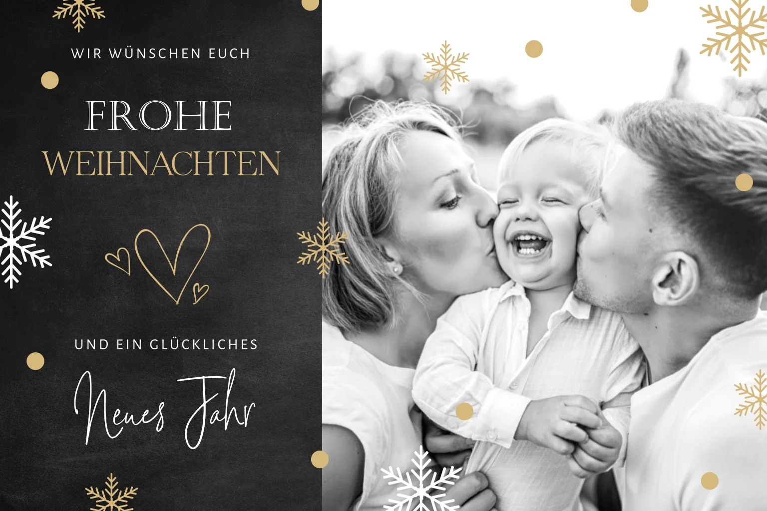 Trendige Weihnachtskarte mit Schneeflocken in Gold und Weiß und Ihrem Foto. Der Hintergrund ist dunkel und lässt die Elemente der Karte besonders gut hervorscheinen.