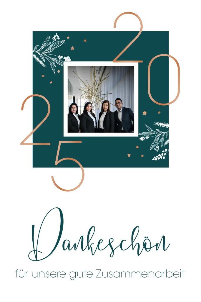 Klappkarte - Hoch goldene Zahl vor grünem Hintergrund verziert mit weißen Zweigen