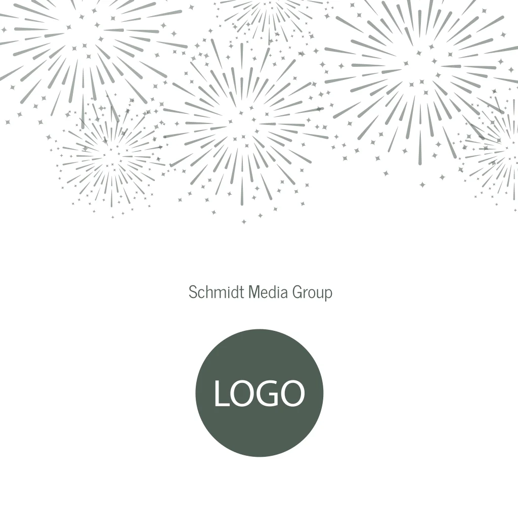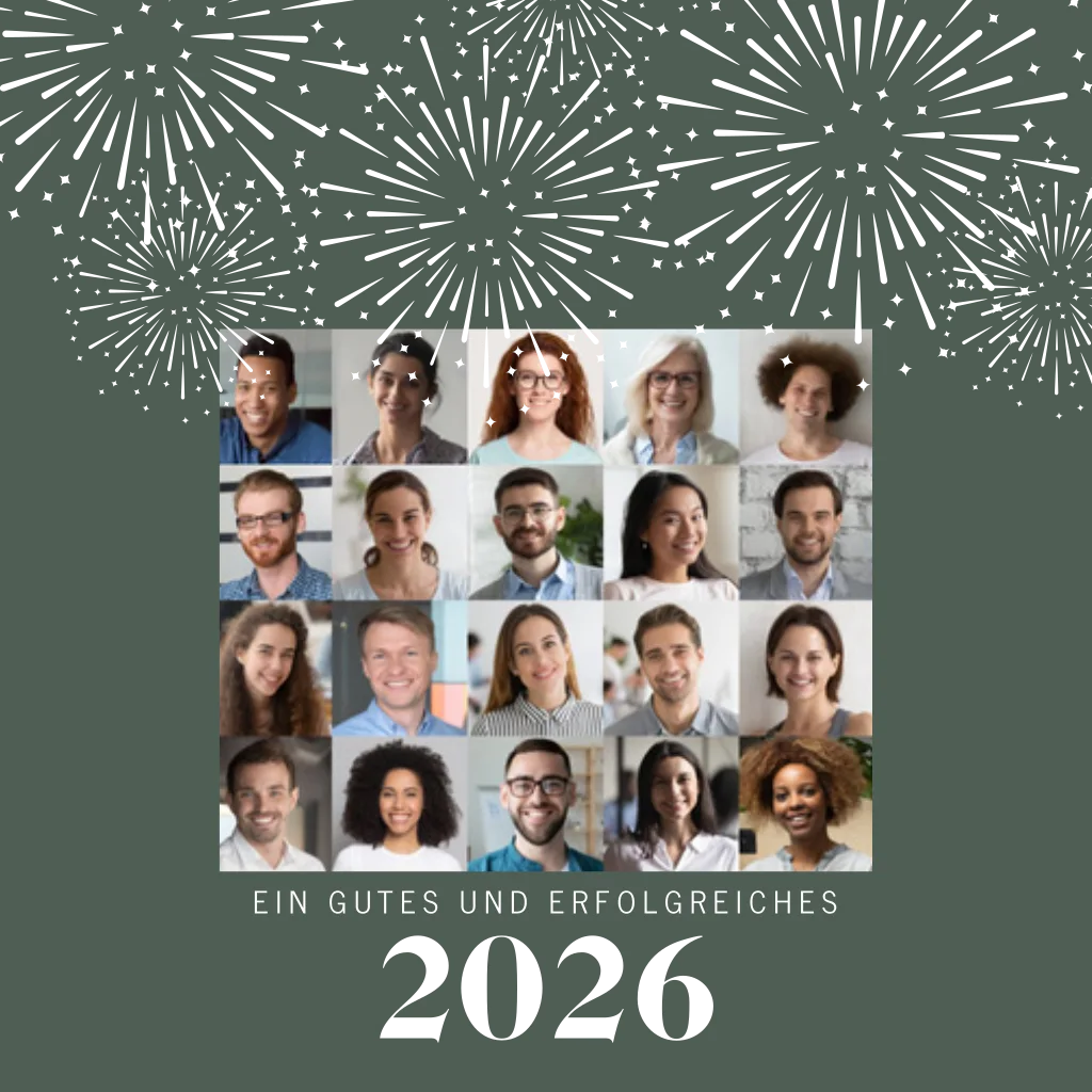 Neujahrskarte mit grünem Hintergrund, kleinen Fotos Ihres Teams und goldenem Feuerwerk in Foliendruck.