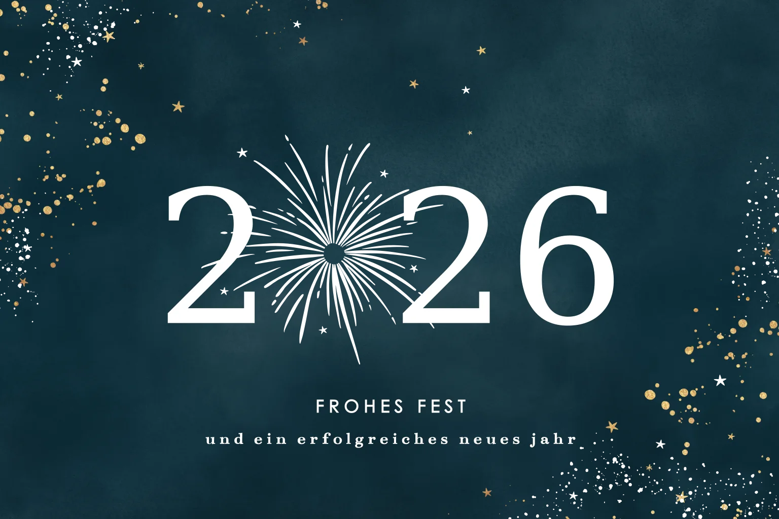 Grüne Neujahrskarte mit goldenen Punkten und der Jahrszahl in weißer Schrfit. die Null von 2022 ist als Feuerwerkelement eingefügt, um der Karte eine besodnere Kreativität zu verleihen. Die verschiedenen Elemente wirken im Foliendruck besonders Edel.