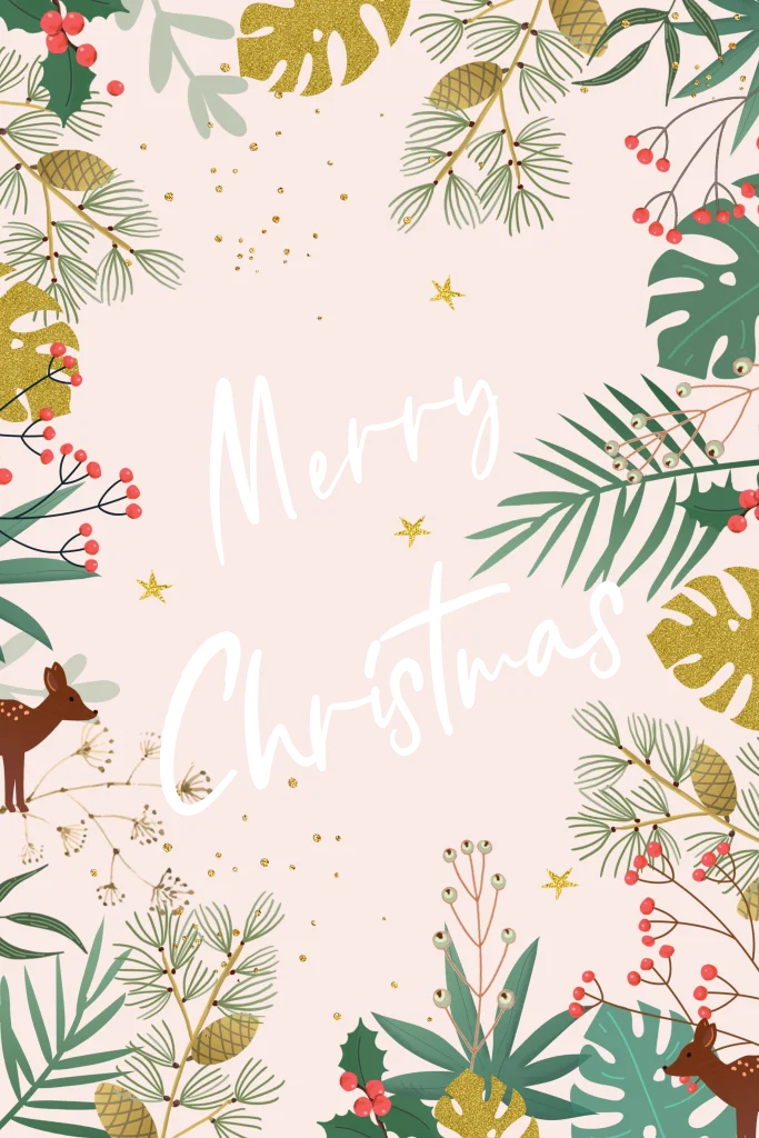Weihnachtskarte mit Blättern und Pflanzen vor rosafarbenen Hintergrund